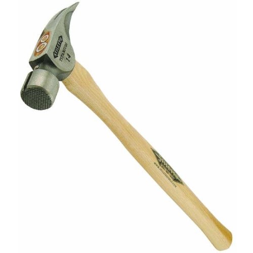 Lightweight 14 oz. titanium head with milled face drives like a 24 oz. steel hammer, but with 45% less weight and 10 times less recoil shock. Less weight and less recoil helps to reduce carpal tunnel syndrome and tennis elbow which translates into less pain, less down time, and more productivity. The 18'' ergonomic American hickory handle allows for greater swing leverage. SureHold wedges assure a solid head to handle connection. Straight claw design gives improved nail pulling performance. Features magnetic nail starter on nose of hammer for easy 1 handed nail starts in overhead work. Dimensions: 18'' x 6'' x 2''. Weight: 1.8 lb.